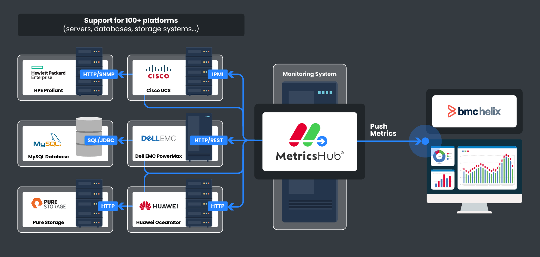 With over 250 prebuilt connectors, MetricsHub extends BMC Helix's visibility across a wide range of technologies: