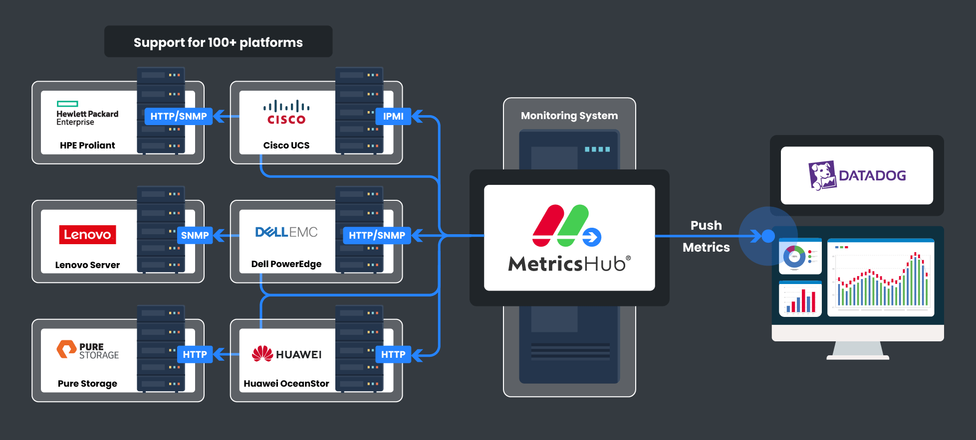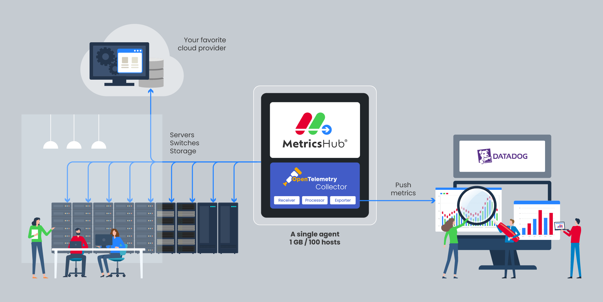 With more than 250+ prebuilt connectors, MetricsHub brings unmatched infrastructure coverage to Datadog: