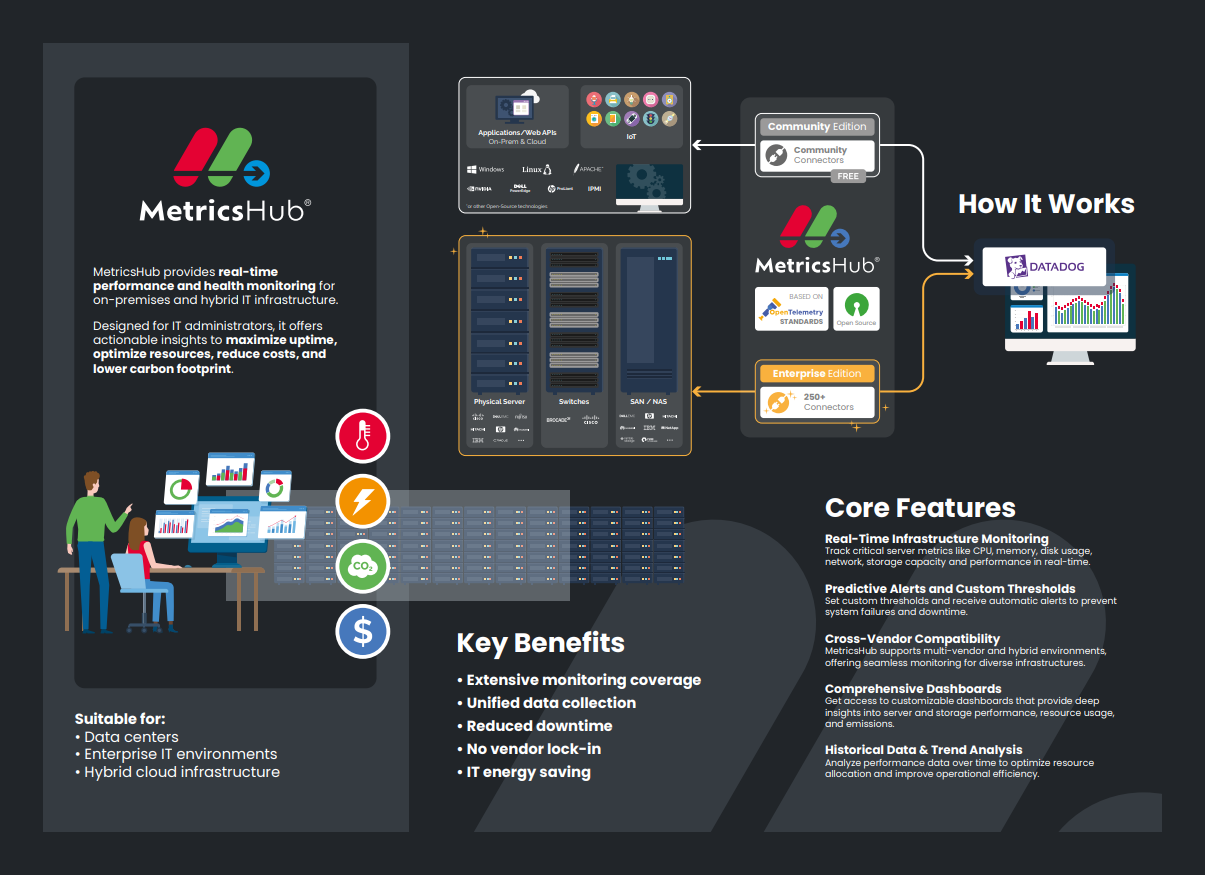 With MetricsHub®, gain real-time visibility into hardware health, system performance, and sustainability metrics across servers, storage, and networks—helping you prevent failures, optimize costs, and run greener data centers.