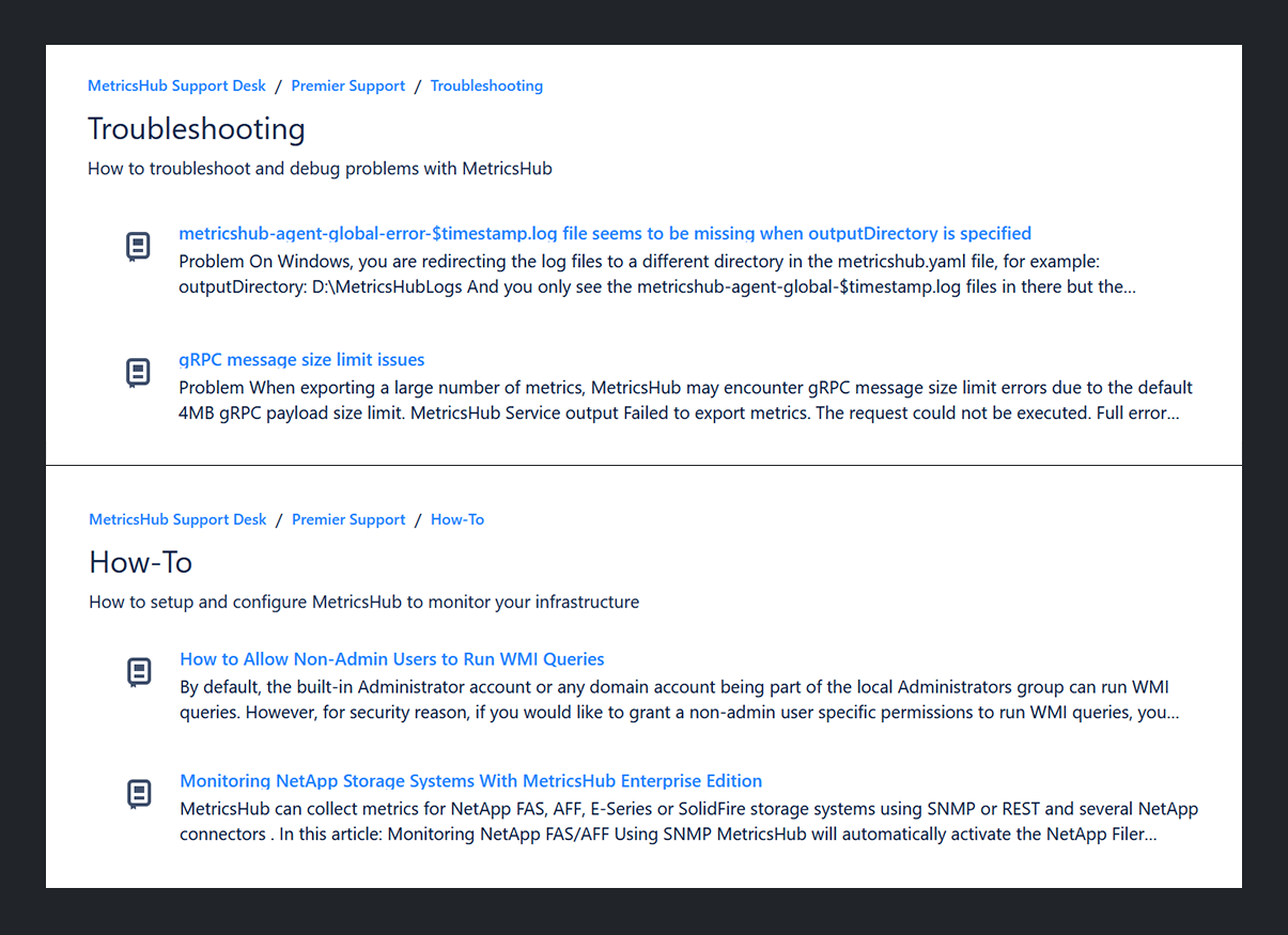 Your subscription includes access to the MetricsHub Support Desk, our premium support service. Our experts are here to ensure a smooth deployment, from installation to advanced configuration. Whether you face an unexpected roadblock or just need best-practice guidance, we've got you covered.