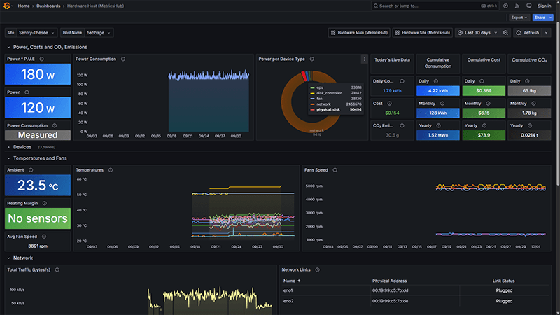 MetricsHub collects detailed health and performance metrics across your infrastructure, covering servers, storage systems, databases, and network devices, and pushes them to Prometheus. These metrics can then be visualized in real time in Grafana using MetricsHub's prebuilt dashboards.