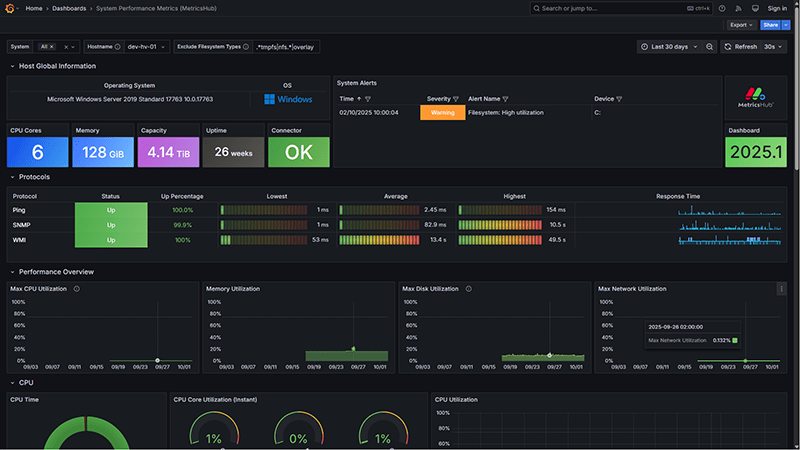 Built for scale and simplicity, MetricsHub integrates natively with Prometheus via OTLP, supports more than 100 types of servers and devices, and includes prebuilt Grafana dashboards and Alertmanager rules.